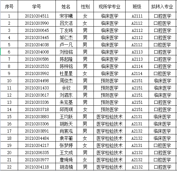医公司2021年经过转出考试和资格审查,以下同学具有转专业转出资格,公示如下: