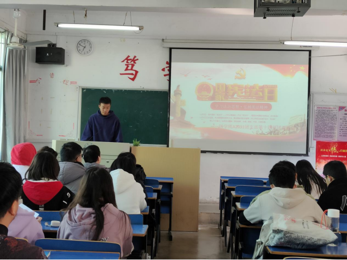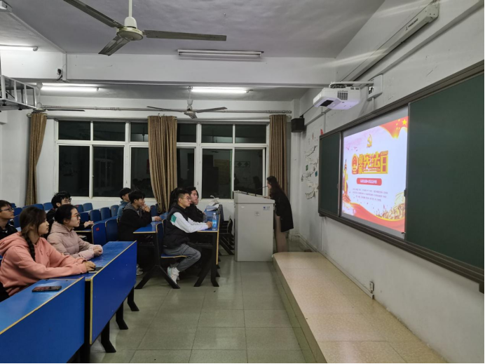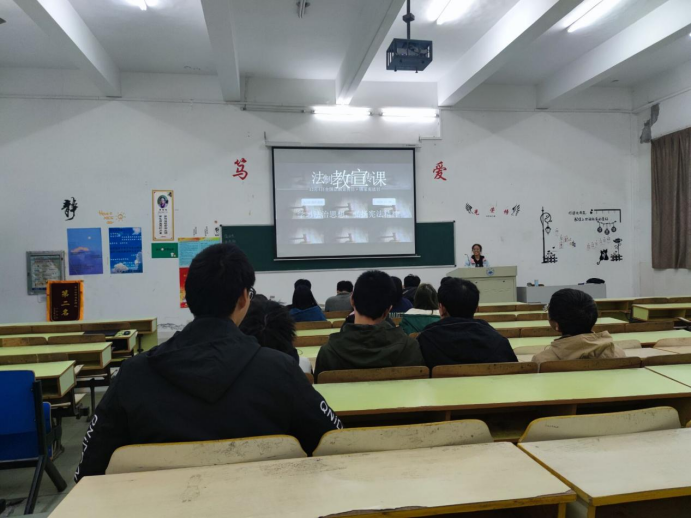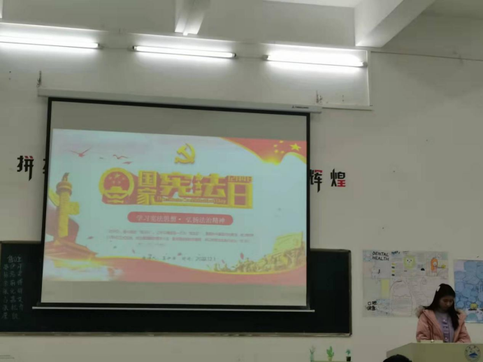 在思贤楼阶梯教室五,A2042班团支书向同学们介绍了弘扬宪法精神的重要意义。建设法治中国,就是要尊重宪法的法律地位,坚持确立的政治、经济、社会制度。宪法与国家前途、人民命运息息相关。维护宪法权威,就是维护党和人民共同意志的权威。捍卫宪法尊严,就是捍卫党和人民共同意志的尊严。保证宪法实施,就是保证人民根本利益的实现。最后团支书还带领同学们朗读了部分宪法内容。