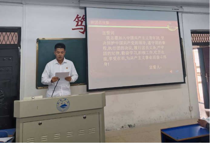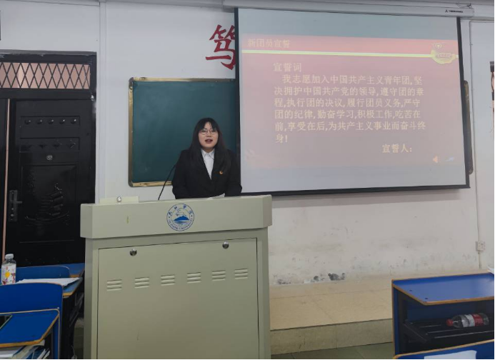 大会在奏唱国歌声中拉开了序幕。首先,岳奋芪同学宣读了新入团人员名单,欢迎新成员的加入。之后由刘频健、老团员员工代表为新团员佩戴团徽。