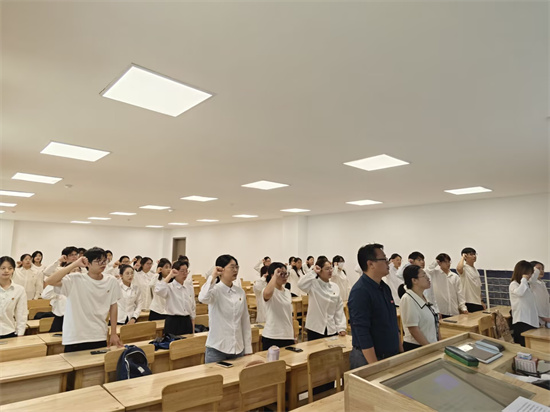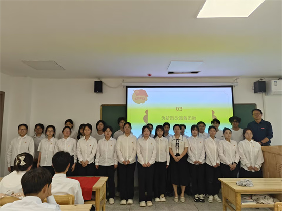 仪式在庄重的氛围中拉开帷幕。全体参会人员起立,奏响国歌,激昂的旋律在会场中回荡,展现出与会人员的青春活力与朝气。主持人宣读了新入团员名单,随后,刘频健、樊云燕和各位团学干部共同为新团员佩戴团徽。闪耀的团徽承载着责任与使命,激励新团员们时刻以高标准要求自己。紧接着,全体团员起立,在领誓人的带领下,面向团旗庄严宣读入团誓词,誓言铿锵有力,响彻全场,展现出他们坚定的决心与信念。