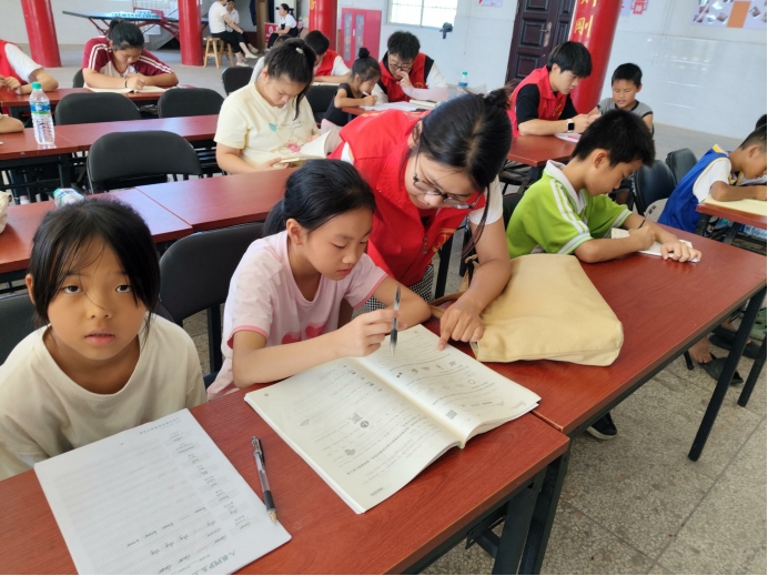 讲解结束后,实践队依据孩子们的不同年龄段,开展针对性的学习辅导活动。针对幼升小的儿童,队员们耐心地教他们学习声母韵母,以及数字的排序和书写;对于一至三年级的孩子,队员们带领他们学唱英文歌,用音乐开启语言学习之门;针对四年级和五年级的孩子,则指导他们练习书法;而对于初升高、小升初的同学,队员们则根据其薄弱科目,进行专项辅导,帮助他们攻克学习难题。