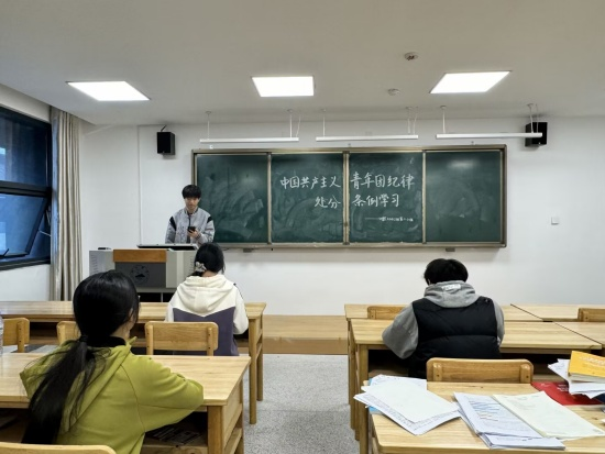 在研究生楼432教室,基础A2511班团支书熊旭宇首先带领团员重温入团誓词,强化身份认同与使命感。随后他聚焦《中国共产主义青年团纪律处分条例(试行)》及团纪规定展开系统学习,结合违规违纪典型案例深入剖析,让团员直观认识到守规矩的重要性。交流讨论环节,团员结合学习生活实际踊跃发言,明确了将团纪内化于心、外化于行的具体路径。