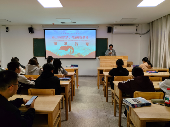 各理论小组组长围绕抗战历史中的关键战役与英雄事迹展开讲解,结合史料片段和影像素材,生动解读了伟大抗战精神的丰富内涵。同时,大家紧扣中国人民抗日战争暨世界反法西斯战争胜利80周年的时代背景,通过今昔对比清晰阐释了革命精神在新时代的现实价值,既强化了同学们的理论认知,也着重强调了青年一代铭记历史、传承革命精神的重要意义。