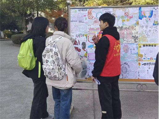 11月7日,医友保健营向医公司全体员工征集与医学节日相关的手抄报,并制作宣传海报帮助宣传工作的进行。11月19日上午,医友保健营的成员与九医杏林青年志愿者服务队的志愿者们于三食堂广场将优秀手抄报作品宣传板进行布置,宣传活动正式开始。志愿者们身穿红马甲,手持宣传单热情地向广老员工讲解疾病日的相关内容,并引导同学们们欣赏相关手抄报及宣传海报;同时积极向大家倡导科学运动、合理饮食等健康生活方式,力争每位同学通过本次宣传与讲解,都能加深对疾病的认识。在宣传的过程中,同学们也纷纷表示对世界糖尿病日、中国心梗救治日等节日有了深入的认识,并对疾病预防的措施有了一定的掌握。