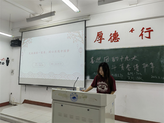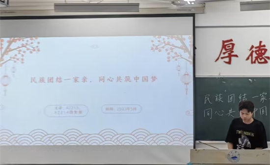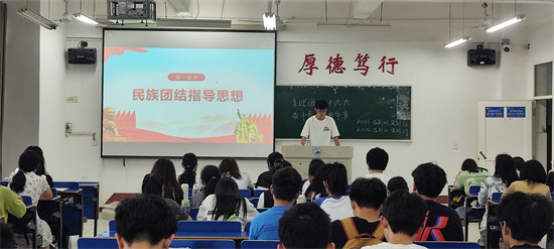 在义丰楼407,A2251班团支书首先向同学们讲述了党的十八大以来,以习近平同志为核心的党中央高度重视民族工作,引领我国民族团结进步事业不断创新发展,推动我国民族团结进步事业取得了新的历史性成就,激励每位同学为实现中华民族伟大复兴的中国梦奉献智慧与力量。