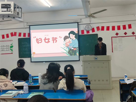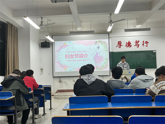 A2241班在香远楼602教室开展团日活动,团支书给同学们讲述了国际劳动妇女节的起源和发展,以及全球各国女性为争取平等权利所作的斗争和努力。团支书还讲解了近代的妇女文化运动和妇女工作在这一时期起到的重要作用。随后,团支书又介绍了国际妇女节的主要推动者和她们的伟大贡献,引导同学们时刻都要尊重女性,要从心底肯定女性同胞们作出的成就。