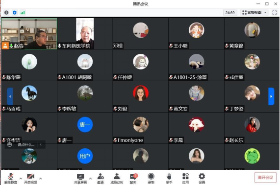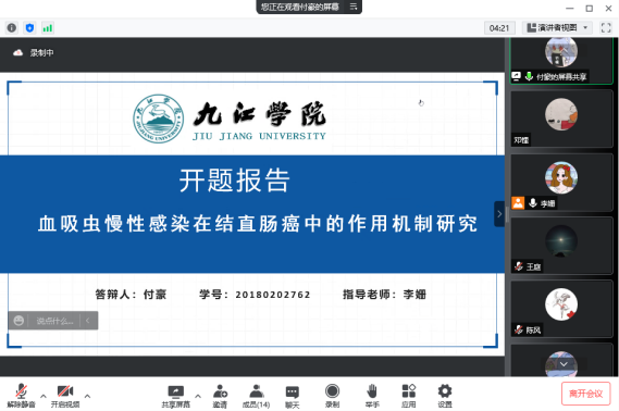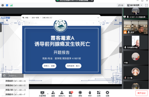 11月23日,医公司组织召开2018级预防医学专业本科毕业论文(设计)开题答辩会,受疫情影响,本次开题答辩会在线上举行。全体论文指导教师和2018级预防医学专业36名员工分4组展开论文开题答辩,医公司经理车向新、党委书记许晓源、副经理向维聂、熊建军等院领导分别参与并指导各小组开题答辩。