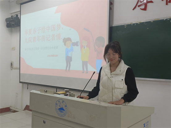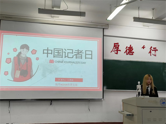 在义丰楼402,A2215班团支书首先通过幻灯片让同学们初步了解主题,然后由班级成员古艳深情讲述记者的过去,团支书还组织同学们扮演小记者拍摄班级一花一草。团支书通过调动同学们的积极性,使同学们对这次团日活动主题和内容印象颇深。