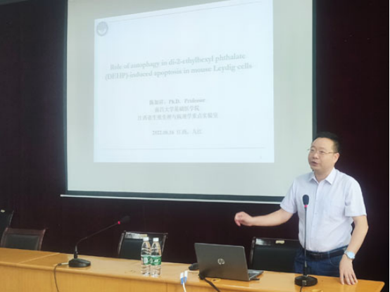 陈加祥教授讲座题目是“自噬在DEHP诱导小鼠睾丸间质细胞凋亡中的作用及机制”。陈加祥教授分别从动物和细胞实验并结合分子生物学等手段,阐述了p53/ARTS信号通路在增塑剂DEHP抑制精子发生的作用及其机理,并明确了自噬在其中的作用。陈加祥教授还与医公司院领导和老师们就医学教学、科研工作做了深入交流。陈加祥教授深厚的学识和精彩的讲授,让老师们深受启发,对促进公司今后教学和科研工作具有积极的意义和作用。