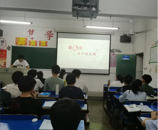 5月24日晚,A2132班全体成员在华文楼阶梯二教室开展了团日活动,此次活动以2020年5月28日,十三届全国人大三次会议表决通过了《中华人民共和国民法典》为背景,时值民法典通过两周年,借此团日活动,和同学们一起学习法律知识。活动临近结束,有同学上台积极发言:“依法办事,以法育人,在这个国家奋力发展的年代,我们要让自己作为法律底线的坚定捍卫者。”