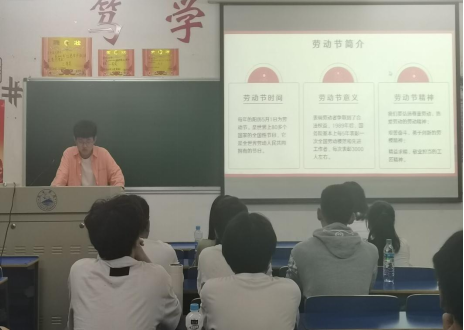 在思贤楼508,A2116班团支书以PPT的形式展示了劳动节的简介并详细讲解了“五一”劳动节的由来与意义。他引用从古至今的例子使同学们认识到要以劳模的卓越贡献引领全社会,以劳模的高尚情操带动全社会。最后,他说到:“只有劳动才能创造幸福,只有奋斗才能实现梦想。我们要拒绝好吃懒做,应当脚踏实地,勤奋好学,用自己的努力为社会、国家尽一份力。”