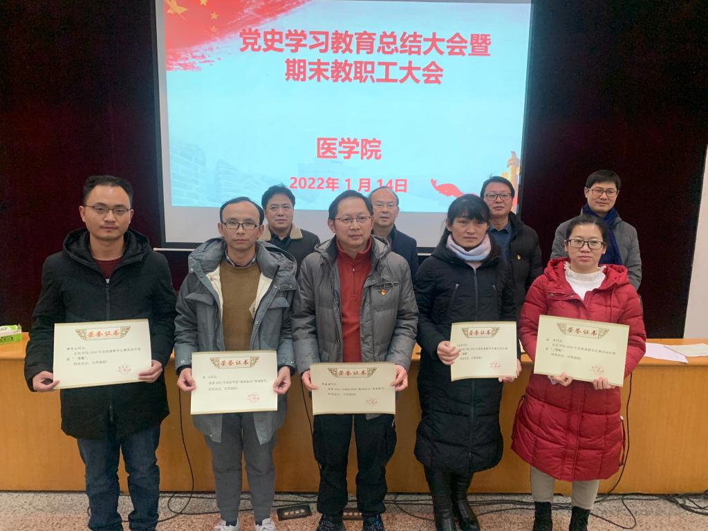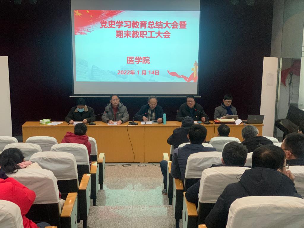 会上,经理车向新向医公司全体教职工传达了中央、省委、市委和公司党史学习教育总结大会精神。强调指出,要深入学习贯彻习近平新时代中国特色社会主义思想,学习贯彻党的十九届六中全会精神,认真总结党史学习教育的成功经验,求实、务实、扎实,建立常态化、长效化制度机制,不断巩固拓展党史学习教育成果。同时传达了陈小林董事长在全校干部大会上的讲话精神,总结了医公司2021年度工作并布置寒假各部门相关工作。党委书记许晓源就医公司党史学习教育工作进行了汇报总结。他指出,自从开展党史学习教育动员以来,医公司积极推动、不断加强全院师生的党史学习教育,开展了参观红色教育基地党日活动,看望革命老战士,举行党史知识竞赛、绘画、朗诵、’红色走读”、”我为群众办事实“等系列实践活动,成绩显著。希望全体教职工继续加强学习,在提高办学水平、提升医员工培养质量等方面做出贡献。