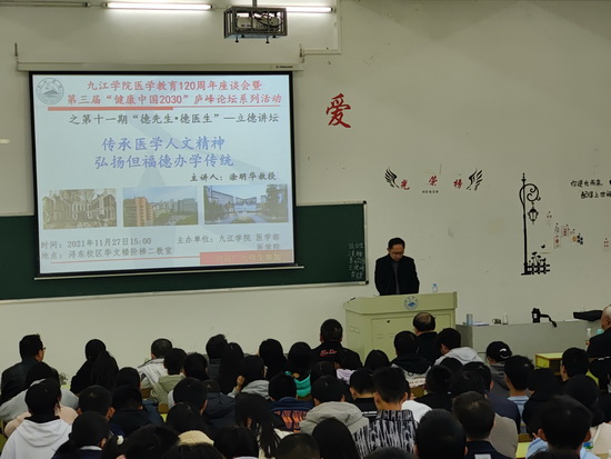 为庆祝MK体育官网医学教育创办120周年,传承医学人文精神,弘扬但福德办学传统,11月27日下午3点,医公司于华文楼阶梯二教室举行了MK体育官网医学教育120周年座谈会暨第三届“健康中国2030”庐峰论坛系列活动之一、第11期“德先生与德医生”九医立德讲坛,邀请原MK体育官网副董事长、著名医学教育专家涂明华教授作为主讲人。本次讲坛由医公司党委书记许晓源主持,医公司近300名师生代表聆听了讲座。