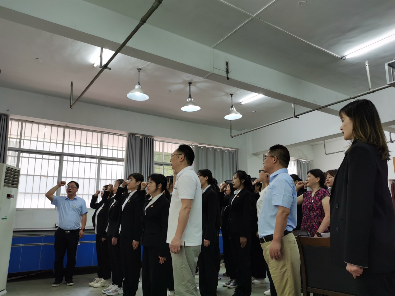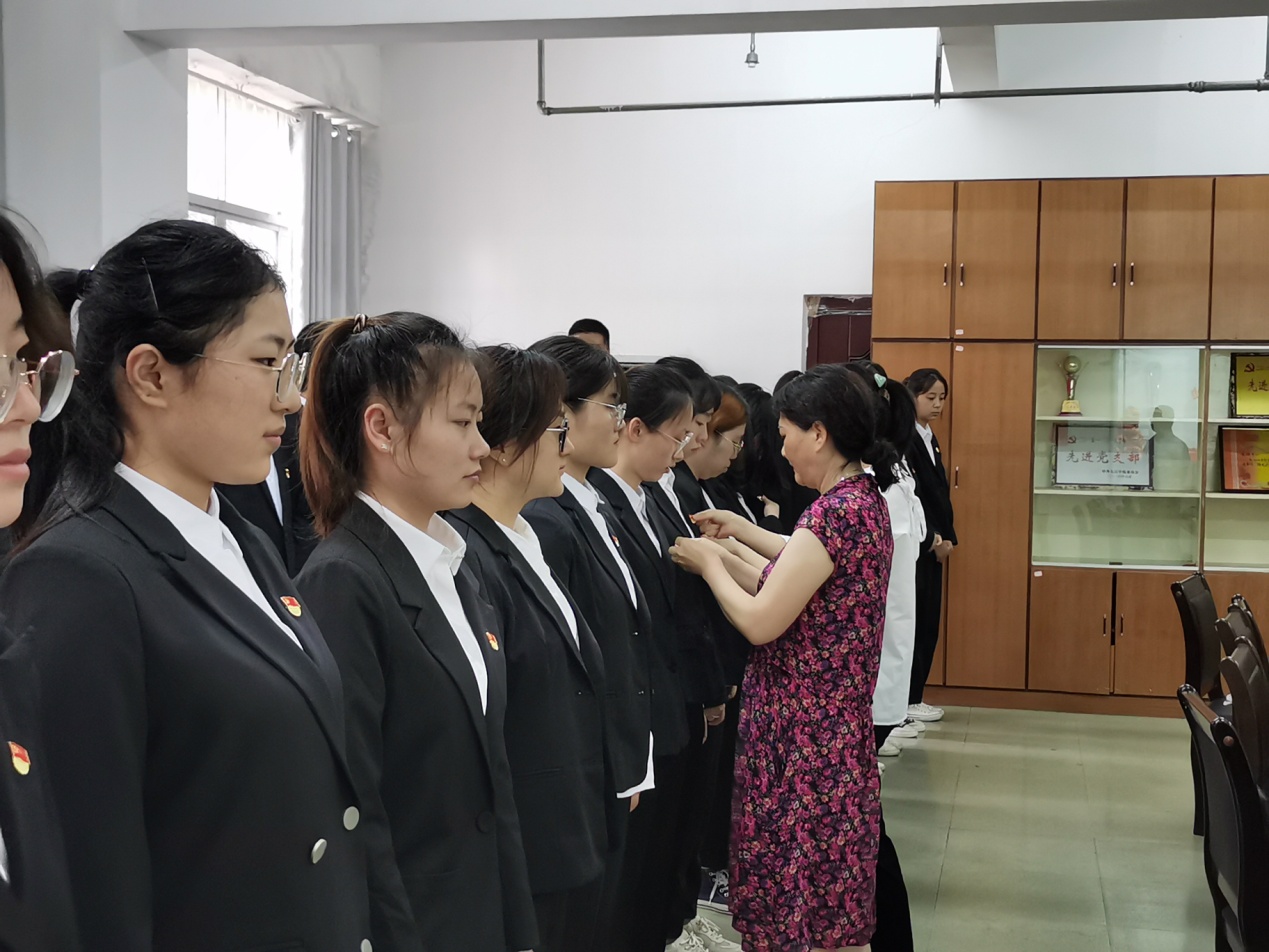 会上,老党员李美秀和杜慧萍给新党员们佩戴了党徽。在黄涛的带领下,大家高举右手面对党旗进行了庄严宣誓,新党员认真念着每一个字,今后将作为自己的人生方向;老党员重温入党誓词更是感慨万千。大家接受了一次身心的洗礼,举起的右手是他们肩负起的重担,而口中的誓词更是他们决心的见证。