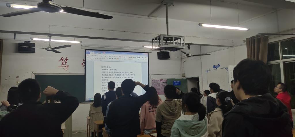 A2041班和A2031班为了激起本院员工的爱国热情,让同学们铭记共产党一路走过来的艰辛,在班长白振屹和团支书程雯星的主持下,在思贤楼组织同学们观看爱国电影《八佰》。电影生动还原了当年那段可歌可泣的峥嵘岁月,回顾了中国共产党奋力抗击敌人、抛头颅洒热血的红色精神,歌颂了革命先辈顽强不屈、誓死捍卫国家的爱国情怀,使在场观看的同学们感受到了革命先辈们对革命事业的崇高信仰和不懈追求,增强了同学们爱国、爱党、爱人民的意识。最后,由程雯星带领班级重温医员工誓词,此次活动落下了帷幕。