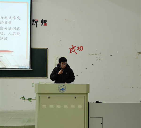 讲座伊始,唐小平同学就英语四、六级考试的总分值、考试时间、与高考英语的差异等方面进行了简单的介绍,重点讲解了试卷的构成,并推荐了相关复习材料。他还向学弟学妹们提出了两点建议,一是要树立好英语学习的榜样;二是要培养良好的学习习惯,持之以恒。在唐小平同学讲解的基础之上,毛纪伟同学结合历年试卷进一步分享了自己的考试经验和技巧。