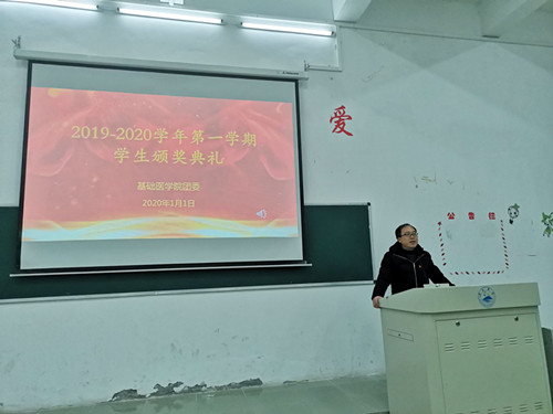 颁奖典礼上,余朝阳代表公司党委和行政致辞,他首先对本次颁奖典礼的举行给予充分肯定,对受表彰的先进集体和先进个人表示衷心的祝贺。余朝阳说,通过这种仪式感强烈的活动有助于提高同学们的荣誉感和责任感,有助于树立榜样标杆,有助于形成人人争当先进,人人争做模范的良好氛围,值得提倡和发扬。讲话中,余书记回顾了这一个学期以来的各项员工工作所取得的成绩,特别表扬了A1942班的郭谢欣鹏同学不惧辱骂和恐吓,挺身而出,对在公交车上吸烟的不文明行为说“不”的勇气,高度赞扬了他这种强烈的公民意识和市民意识,展示了MK体育医员工良好的精神风貌,树立了MK体育官网老员工的正面形象,体现了新时代老员工的担当精神和社会责任感,也是基础医学经理期坚持医德医品教育,夯实医员工医学人文基础,培育和践行社会主义核心价值观的成果体现,余朝阳号召全院师生向郭谢欣鹏同学学习,做一名新时代“文明卫士”。最后,余书记重点阐述社会主义核心价值观对我们每位公民的要求,希望全体同学们都要做到“爱国、敬业、诚信、友善”四项要求,成为一名德智体美劳全面发展的合格社会主义建设者和接班人。