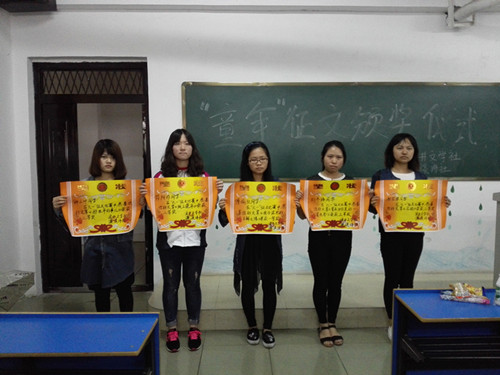 | 为锻炼大家的写作能力,同时表达对童年的怀念,6月4日中午,浪井文学社和濂溪诗社联合举办的“六一”征文活动评选活动在华文楼102举行,获奖选手以及社员们到场参加此次颁奖仪式。  此次活动,引起了同学们极大的热情,在短短的几天里,就收到了大量文稿。在同学们的作品中,我们再一次体会了一次童年生活的美好。经过大赛评委的精心挑选,共有15篇文章进入复选。最后,通过微信投票和评委的共同筛选,从15篇文章中选出:一等奖《我与泥巴的不解之缘》傅瑜红;二等奖《那些年的事儿》钟小叶,《线上童年》符阿玲;三等奖《顾》刘锦秀,《花逝》谢招娣,《童年,回忆里的一道光影》刘冬梅。  本次征文评选活动,不仅让大家回忆起童年的趣事,而且丰富了同学们的老员工活。 |