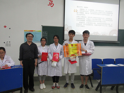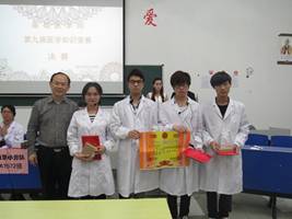| 为了强化同学们的专业知识,增强同学们的对医学学习兴趣,5月18日晚,MK体育于华阶二举行第九届医学知识竞赛决赛。MK体育经理车向新,党委书记余朝阳,副经理郑美蓉,院办主任李美秀,特邀嘉宾解剖教研室主任傅文学,以及全体辅导员、班主任到场观看本次比赛。    经过初赛、半决赛的激烈角逐,三支代表队进入最终决赛。此次比赛共五个环节:你问我答,争分夺秒,心有灵犀,各抒己见以及最后的终极PK环节。在前两个环节中,充分体现了选手们丰厚的知识积累和临场的变通能力;心有灵犀环节考验的是团队之间的合作与默契,而最后的两个环节考验的则是选手们的语言组织能力和风险承受能力。  竞赛中,各代表队选手思维敏捷,知识运用娴熟,回答问题镇定自若。比赛一开始就显示出各队的实力,经过前两轮环节比赛,场上比分难分高下,台下观众也看得兴致昂然,整个比赛过程紧张不失活泼,赢得现场一波又一波热烈的掌声。  解剖教研室主任傅文学老师针对各抒己见环节各代表队对医患关系的陈述作了精彩点评。他赞扬了作为一名医生的伟大与奉献,并呼吁我们通过友好的沟通去舒缓当今紧张的医患关系。  随后,车向新经理作总结性讲话。他首先肯定了本次比赛的创新环节——各抒己见中的视频环节,通过视频让我们学习到了作为一名医生的奉献精神和责任感。其次,他说,医学应该是一个较为广博的专业,他建议比赛的题目内容视野可以更加开阔一些,同时,他也对组织医学知识竞赛辛苦付出的老师和同学表示了感谢。     经过紧张激烈的角逐,B1513班代表队获得冠军,A1572班代表队获得亚军,B1511班代表队获得季军。院领导为获奖队伍一一颁奖,并合影留恋。 |