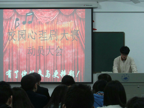 会上,心理导航部代表首先对心理剧大赛做了简单介绍并阐明了一些要求,希望同学们以“关爱生命,阳光你我”为主题,做好前期的准备工作。然后两位员工代表作表态性发言,纷纷表示一定积极组织参与好此次比赛,追求生动形象的表演,在学习中演绎,在演绎中学习,旨在传播健康心理,增添校园文化。