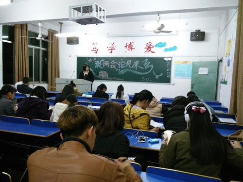 班会上,团支书不仅给同学们宣传两会的相关知识,还介绍本届两会的讨论热点和决策。而后,同学们就重点关系民众生活的话题展开热烈地讨论。