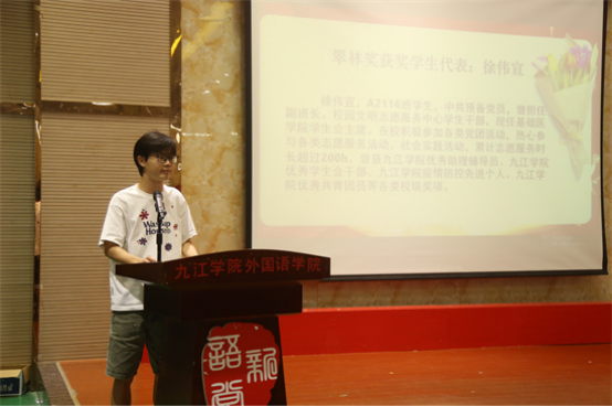 获奖员工代表医学A2116班徐伟宣和A2252班罗岚烨同学依次上台发言。他们分享了自己的学习经验和心路历程,表达了对公司和余翠林女士的感激之情,并鼓励同学们珍惜在校时光,努力学习专业知识,勇敢地面对未来的机遇和挑战。