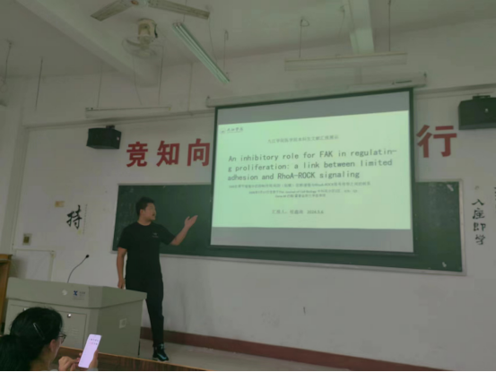 李兴暖博士指导的黄龙圣和桂鑫海两位优秀员工精心准备,深入研究各自文献课题,选出高质量文献进行阅读汇报,展现出扎实的专业知识和出色的表达能力。已经考上南京医科大学研究生的黄龙圣同学首先进行了“OTUB1通过稳定FGFR2促进成骨细胞骨形成”的文献汇报。他以清晰的逻辑和深入浅出的讲解,将文献中的核心内容和研究成果一一呈现,不仅阐述了该领域的研究现状和热点问题,还提出了自己的见解和思考,引发了在场师生的热烈讨论和深入思考。随后,桂鑫海同学分享了“FAK通过RhoA-ROCK通路调节细胞粘附性增殖”的文献研究成果,以独到的视角和详细的分析,吸引了大家的注意力,通过对相关文献的梳理和总结,展现了该领域的发展趋势和潜在的研究方向,为在场的师生提供了新的启发和灵感。