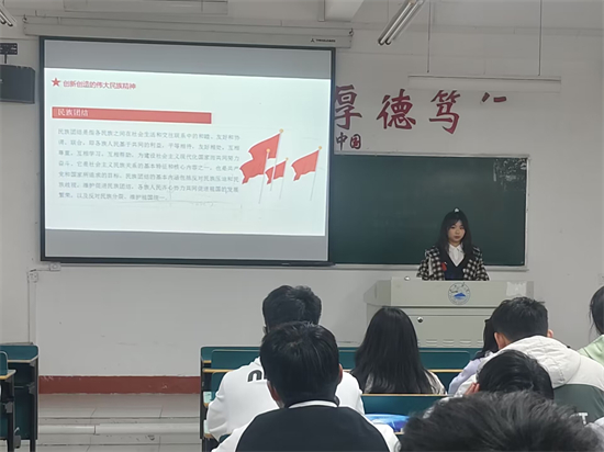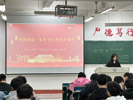 在香远楼303,A2314班团支书通过民族大团结的视频引出本次团日活动的主题,并为同学们讲述党在民族工作中提出的一系列新理念、新思想、新观点,采取的一系列新举措。激励每位同学为实现中华民族伟大复兴的中国梦贡献智慧与力量。