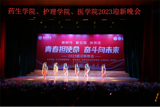 迎新晚会正式拉开序幕,首先是医公司、药学与生命科学公司、护理公司的三位领导及员工干部携手呈现的合诵《长江之歌》,在对长江的歌颂中,表达了中华儿女对神州大地的无尽热爱;医公司舞蹈队献上的《青玉案·元夕》,古风盎然,令人心醉神迷,用舞蹈的语言描绘了一个欢乐、浪漫的夜晚,仿佛穿越千年时空,重现新春佳节的盛景;声乐队带来的《医路星辰》,唱出了医者的心声和使命,歌声深情而激昂,每一个音符都充满了力量和信念;主持队表演的《彩虹节拍》,用活力四射的舞步,舞动青春;朝气蓬勃、奋发向上的精神面貌,彰显了同学们的青春风采;紧接着舞蹈队的《Dancing boom》点燃全场,整齐划一的舞蹈动作,别出心裁的创意,充满活力的舞姿诠释了医学的节奏和魅力,让在现场的观众置身于生命的律动中;晚会接近尾声,A2318班带来一曲《万疆》,经历了岁月变迁,悲喜沧桑,华夏大地仍于霞光中绽放出耀眼的光芒,脚踏着黄土地,感受着万疆胸怀,曼妙的舞姿诉说着一腔爱国之情。最后晚会在领导们与表演者的合影留念中圆满落下帷幕。