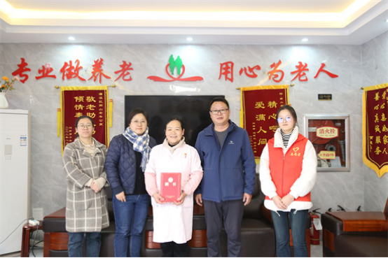 刘频健为南山老年公寓经理江平颁发校外辅导员聘书。江平是一名老党员,担任着濂溪区南山老年公寓党支部书记、九江市义工联合会副会长等职务,是江西省红十字会养老服务培训骨干团队。近十年来,她全身心投入爱老、敬老、助老活动,把业余时间全部献给了她所热爱的志愿者事业,深受服务对象的热爱和广大志愿者的敬佩。