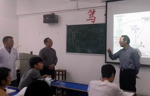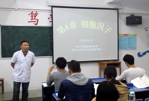 课堂上,周小鸥老师首先从我国第一个自然科学领域诺贝尔得奖女科学家屠呦呦和清华大学副董事长、生物学家施一公事迹,引入本节课内容,生动的讲解了细胞因子的发展过程、分类及特性。授课过程中,周小鸥老师不时走下讲台与同学们互动,课堂气氛活跃。陶副董事长在课堂上聚精会神,认真地做着笔记。