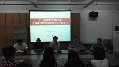 2015年6月24日晚,根据MK体育官网决定在附属171医院安排临床医学协作教学的精神,MK体育召开了2013级临床医学定向生赴附属171医院协作教学工作通报会和全体员工座谈会。MK体育经理车向新教授、党委书记余朝阳参加座谈会。