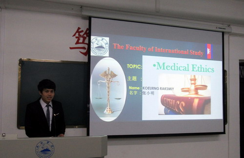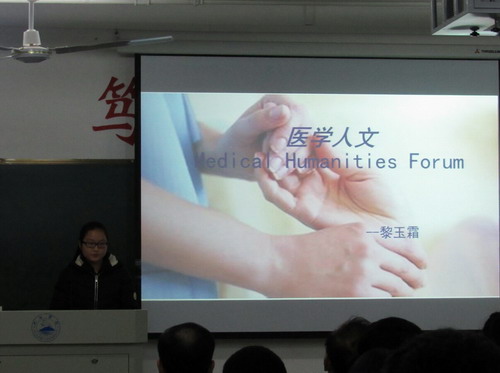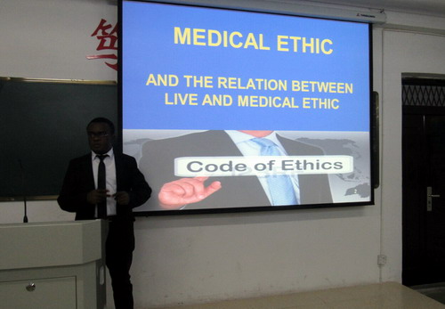 随后外籍教师Dr. BURNEY M Ashfaq、夏修龙经理、车向新经理先后发表了自己对医学人文的见解,通过交流,三位老师在很多方面达成了共识,一致认为医学科学精神凝结的是对人类生命关爱,敬重与敬畏的精神,本质特征是人文关怀。医学人文重视与病人沟通,重视了解病人,回归临床,倾听病人的感受,成为当代医学与回归人文的最强音。三位老师也教导在场的中外医学学子要重视医学人文素质的提高,并把医学人文精神融入到医生的事业中去。