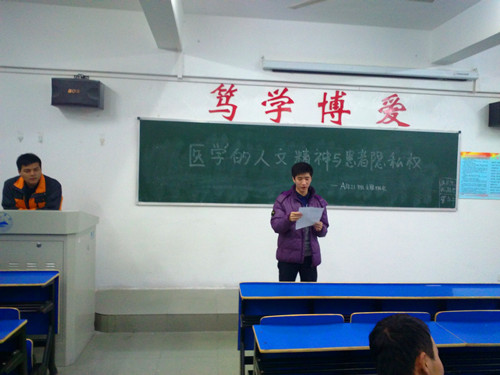 会上,一位同学讲述了自己对人文精神的理解:“医学人文精神是医疗服务行业的重要精神资源,以人为本,尊重患者的隐私,保护患者的权益”。接着,另一位同学对患者隐私权阐述:“隐私是患者的因诊疗服务需要而被医疗机构及医务人员合法获悉,但不得非法泄漏的个人秘密,而隐私权是指病人拥有保护身体的隐秘部位、某些疾病、病史、生理缺陷、特殊经历、遭遇等隐私不受任何形式的外来侵犯的权利。”期间,同学们积极交流,气氛融洽,此次班会圆满结束。