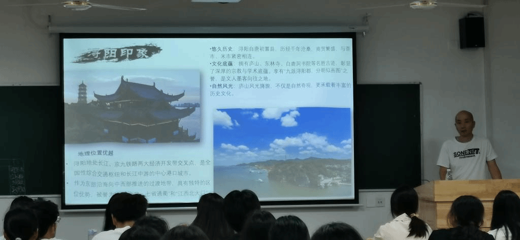 讲座伊始,朱秘书长先以“浔阳印象”为题向同学们科普了九江的历史、地理、文化等方面的内容,让大一新生对九江有了初步的认识。接着,他通过两组老照片,包括锁江楼、琵琶亭、九江关、龙开河铁桥、能仁寺大胜塔、李公堤、烟水亭、大中路和老旧居民区等,为大家直观形象地展示了新旧中国背景下九江城区面貌的巨大反差,展现了新中国成立以来九江城市建设的巨大成就。