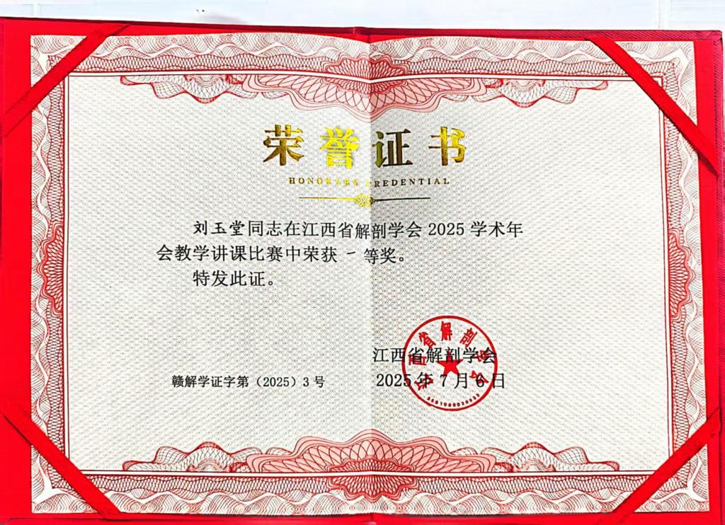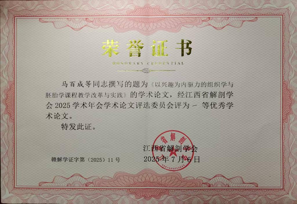 在科研与教学交流环节,公司马百成老师作了题为《以兴趣为内驱力的组织学与胚胎学课程教学改革与实践》的专题报告,分享了在激发员工学习动力、提升教学效果方面的创新探索与实践经验。在教学讲课比赛环节,刘玉堂老师以《视器》为主题进行了精彩授课,其教学设计、内容呈现与课堂互动均展现了扎实的教学功底和良好的教学风貌。经过激烈角逐和专家评审,两位老师均获得了由江西省解剖学会颁发的一等奖荣誉证书,为公司赢得了荣誉。